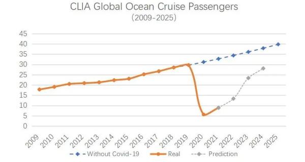 乐观估计,2021年邮轮游客将恢复至891万人次,达到疫情前30%水平,整体市场或将在2025年左右回到疫情前水平(如下图预测)。同时,预计2023至2027年将有50艘邮轮交付,邮轮市场前景依然向好。
