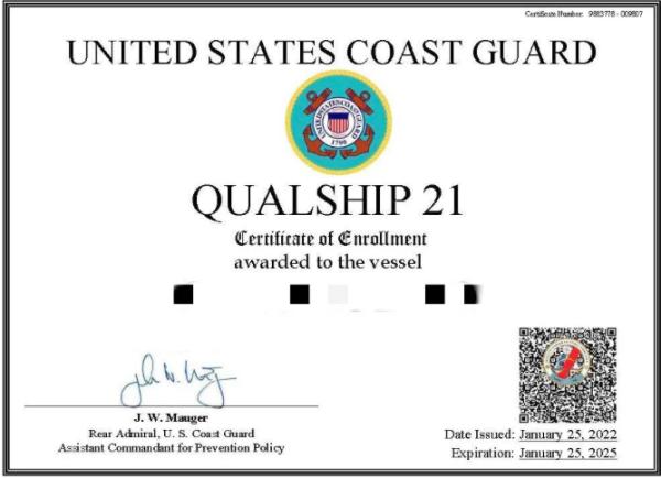 该系列证书依托于美国海岸警卫队2001年开始实施的“21世纪优质船舶计划”(QUALSHIP 21 PROGRAM),是业内最难获得的质量认证证书之一,仅有不足20%航行于美国的船舶满足标准。在该证书有效期内,美国海岸警卫队免于对船舶进行PSC检查,有利于缩短船舶停港时间、提升船舶运营效率。该系列证书的成功获得,既体现了美国海岸警卫队对船管公司、船舶、船员的高度认可,也彰显了公司船舶管理工作的能力水平。