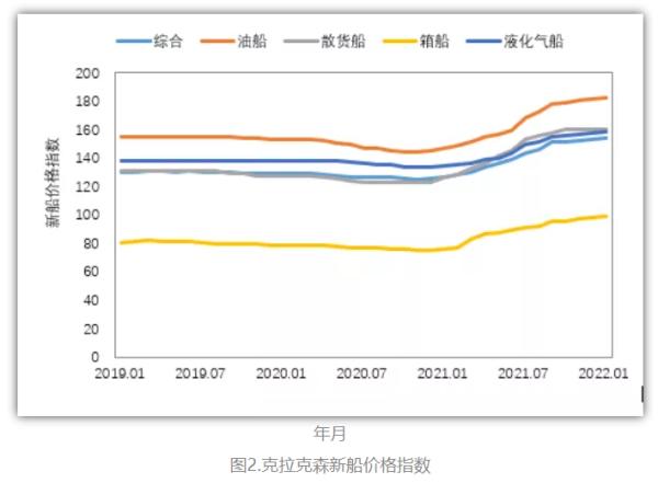 2022年以来,钢板价格略有回调,但新船价格仍保持高位上升态势。截至2022年1月,克拉克森新船价格指数收于154点,环比持平,同比上涨27点。从主力船型看,散货船、油船、集装箱船和液化气船的克拉克森新船价格指数分别为161点、183点、99点和159点,环比分别上涨0点、1点、1点和1点;同比分别上涨34点、36点、23点和24点。各典型船型新船价格均有上涨,VLCC、23000TEU超大型集装箱船和17.4万立方米LNG船的新船价格分别达到1.14亿美元、1.93亿美元和2.14亿美元的高位水平。