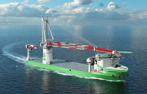 “Orion”总长216.57米,宽49米,型深16.8米,设计吃水8.5米,操作吃水10.5米,设计航速14节,有效甲板载荷25370吨。荷兰船舶设计公司C-Job为这艘风电安装船提供基本设计。