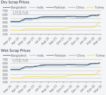 船舶现货买家GMS表示,随着孟加拉国、印度甚至土耳其近期出现钢板价格创纪录下跌,市场很可能已经见顶。食用油和大宗商品价格是此次下跌的主要原因,目前无法预测市场是否将继续上涨。即便如此,当前市场已到达十年来的高点,拆船价格在过去一年至少翻了一番。