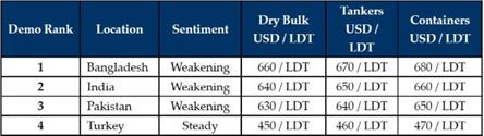 GMS指出,租船市场尤其是干散货船和集装箱船板块表现出色,油轮板块的某些航线开始回升,这使拆船厂很难增加产量,从而导致价格保持平稳。尽管近期拆船价格有所下跌,但大宗商品价格依然坚挺,且地缘政治危机仍未结束,市场还有再次改善的机会。