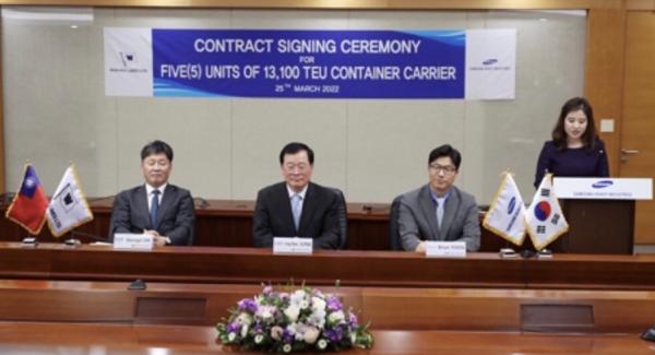 3月25日,万海航运与韩国三星重工就5艘13100TEU新造船举行了线上签约仪式。