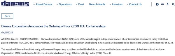 近日,全球最大独立集装箱船船东Danaos再次下单4艘7200TEU集装箱船(甲醇预留),将其新造船订单扩大至 6 艘。
