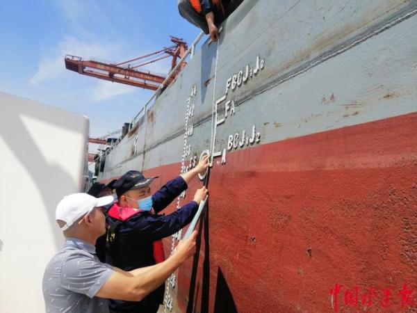 “您好,现在我们将对照船舶检验证书测量船舶水尺勘划情况,依照《国内航行船舶载重线及货物装载专项检查表》上相关检查要求,对您船开展现场检查,请您配合!”2022年5月7日,黄石海事局鄂州海事处北门执法大队执法人员在鄂钢码头对停靠在此的“皖强盛xx”轮开展船舶载重线和货物装载专项检查。