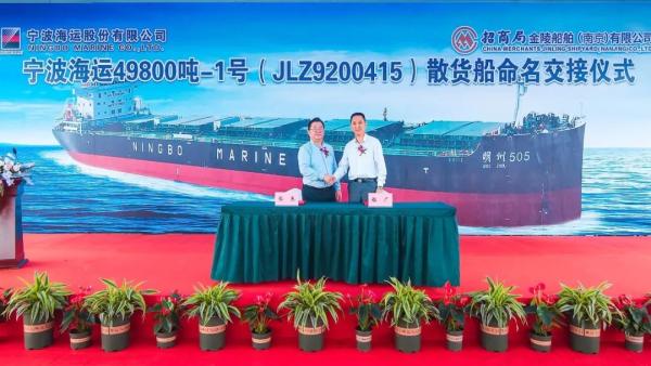 9月16日上午,招商工业南京金陵船厂为宁波海运建造的首艘49800吨散货船在仪征厂区举行命名暨交接仪式。浙江省能源集团有限公司副总经理王建堂、资产经营部主任陈明东,浙江能源煤炭及运输分公司党委书记章勤、副总经理赵阳,宁波海运股份有限公司董事长董军、总经理蒋海良,招商局工业集团有限公司总经理助理、南京金陵船厂党委书记/总经理姜福海等领导嘉宾出席仪式。南京金陵船厂常务副总经理丁健亮主持仪式。