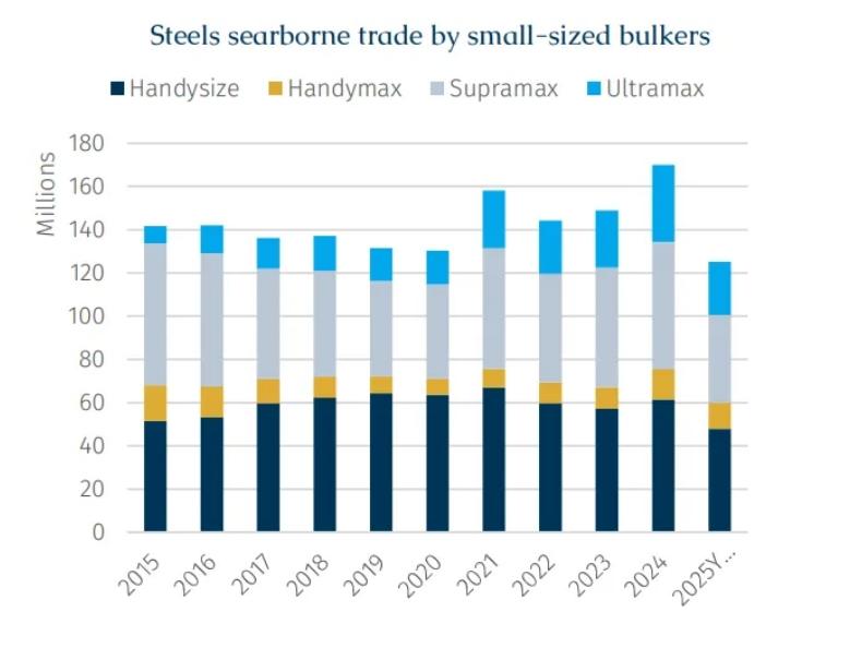 BRS分析师刘青知表示,过去十年全球海运钢材运输量在2015至2020年间呈温和下降趋势,但自2021年以来,这一趋势明显逆转,2024年海运钢材量达到1.7亿吨,同比增长14.2%,带吊散货船承担了绝大部分运输任务。2025年前八个月,这一运输量进一步增长10%,达到1.2亿吨。