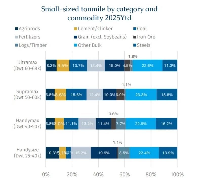 今年前八个月,从灵便型到极灵便型带吊散货船运输吨英里数据显示,粮食(不含大豆)、化肥和钢材仍是最主要的货种,占比分别约为10–20%、12–15%和11–14%。