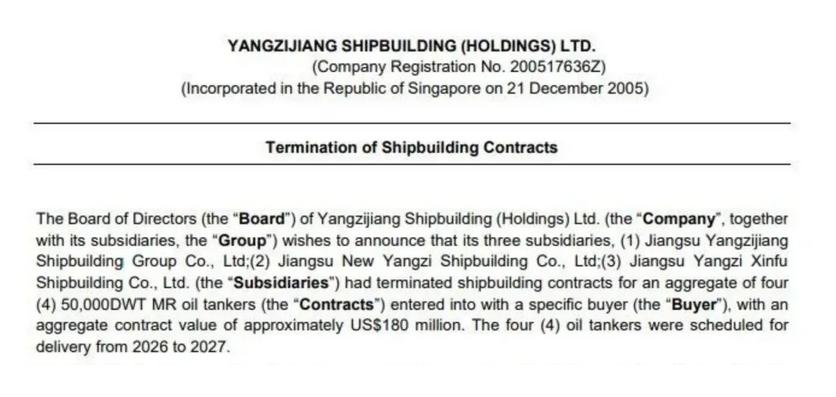 扬子江船业公告显示,江苏扬子江船业集团有限公司、江苏新扬子造船有限公司、江苏扬子鑫福造船有限公司三家子公司共同决定,终止与特定买方签订的四艘5万载重吨MR型成品油轮合同。理由是该买方的唯一股东被曝涉嫌参与规避美国制裁法规的计划,构成了潜在违约与履约障碍。