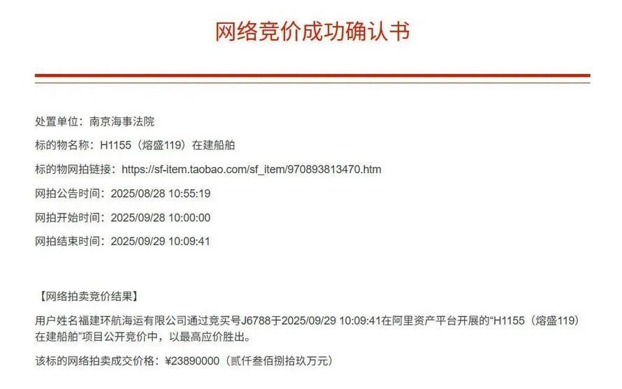 本次拍卖吸引了两位竞买人参与。经过共计6次出价,最终在9月29日上午10时,福建环航海运有限公司通过竞买号J6788,以最高应价2389万元成功竞得该标的。网络竞价成功确认书已确认此次交易。