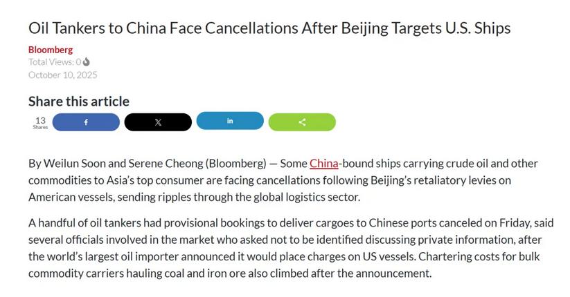 事实上,新政对航运市场的影响已经产生。随着中国宣布对美国籍船舶征收港口费用,一批原计划驶往中国的油轮和大宗商品船舶遭遇取消,全球能源与干散货运输市场由此掀起连锁反应。