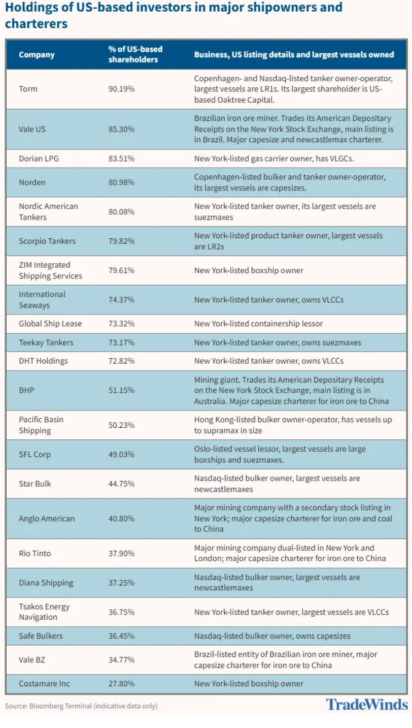 由 TradeWinds 整理、基于 Bloomberg Terminal 数据的图表,系统地展示了美国投资者在全球主要船东与租船公司中的持股比例,揭示了美国资本在国际航运版图中所占据的深厚影响力。
