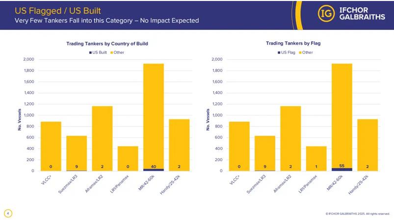在全球航运市场的版图中,美国的身影微弱得几乎难以察觉。以油轮市场为例,来自 Ifchor Galbraiths 的最新数据显示,在全球所有运营中的油轮中,真正由美国建造、或悬挂美国船旗的船舶数量极少,且主要集中在中小型成品油轮领域。这一结构性事实,揭示了美国在航运产业链中的角色:资本强国,却非造船或船队强国。
