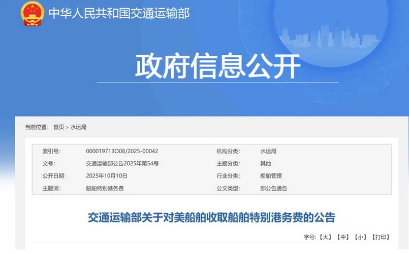 10月10日,交通运输部发布《关于对美船舶收取船舶特别港务费的公告》正式反制。公告称,自2025年10月14日起,对美国的企业、其他组织和个人拥有船舶所有权的船舶;美国的企业、其他组织和个人运营的船舶;美国的企业、其他组织和个人直接或间接持有25%及以上股权(表决权、董事会席位)的企业、其他组织拥有或运营的船舶;悬挂美国旗的船舶;在美国建造的船舶,由船舶挂靠港口所在地海事管理机构负责收取船舶特别港务费。(详情见《正式反制!对美船舶收取船舶特别港务费!》)