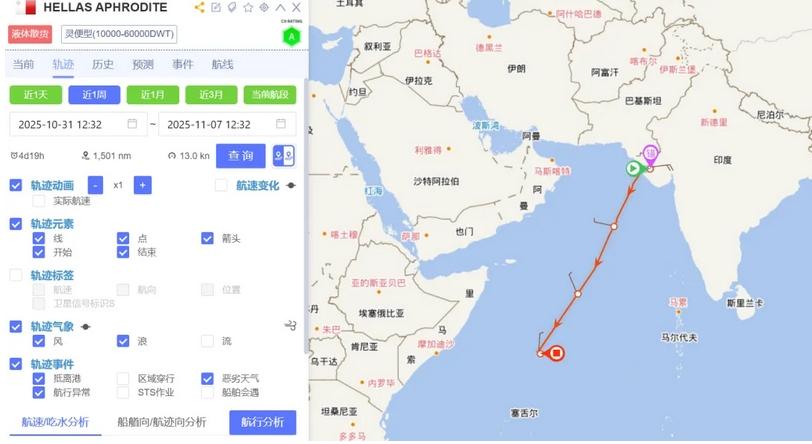 据公司11月6日声明,事件涉及2016年建造的MR型油轮“Hellas Aphrodite”轮。该船当时正载运汽油货物,从印度Sikka前往南非德班,在距离索马里海岸约500海里处遭遇袭击。公司表示,船上24名船员目前全部安全,公司正与船舶保持密切联系,并已启动应急响应机制,与相关部门协调处理。