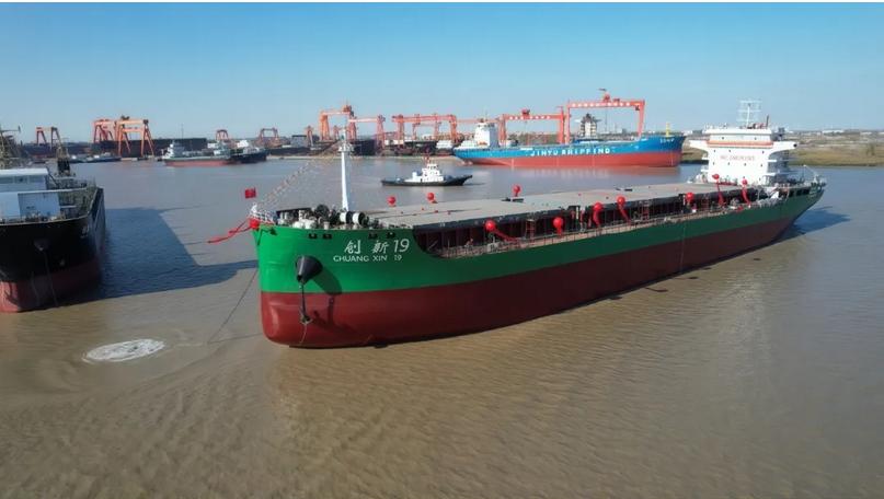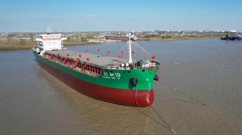 2025年11月25日上午,江苏勤丰船业有限公司船台现场彩旗招展、气氛热烈,国内首艘15000吨级甲醇单一燃料动力江海直达散货船“创新19”轮吉水仪式隆重举行。作为我国绿色智能船舶发展的重要里程碑,该船的顺利吉水,标志着我国在清洁能源船舶领域实现关键突破,为航运业低碳转型树立了新标杆。