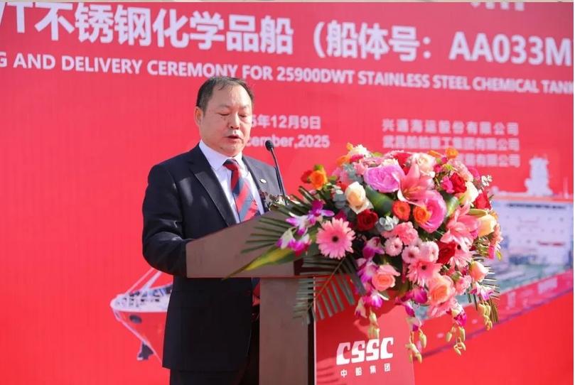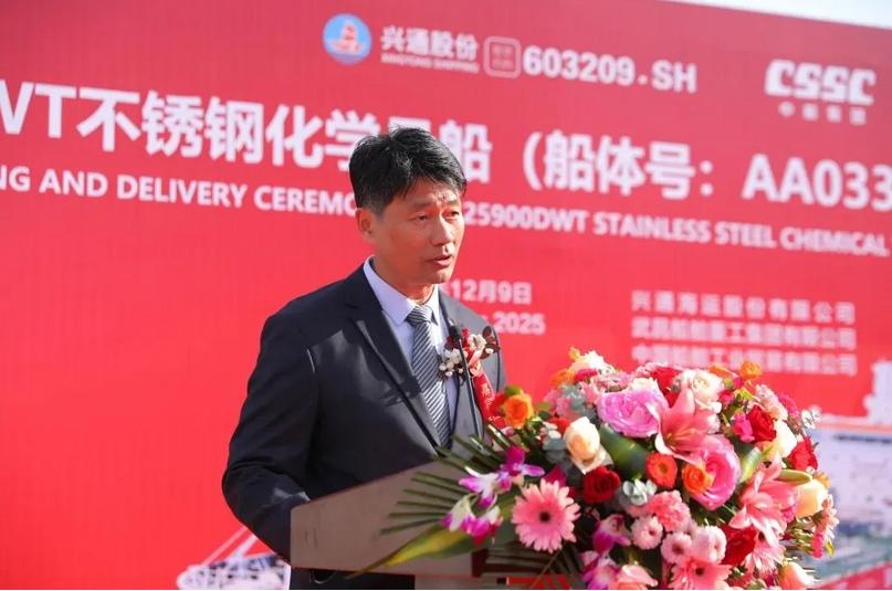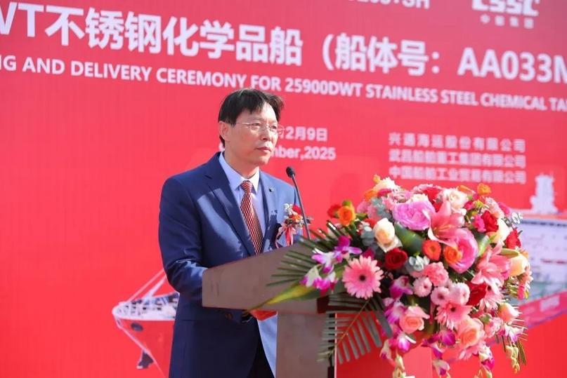 武昌造船副总经理田军表示,此次交付的25,900载重吨不锈钢化学品船作为系列第二艘船,是武昌造船与兴通股份精诚合作、携手推进船舶工业高质量发展的又一重要成果。船舶继承了该系列“绿色、智能、高效”的优良基因,采用先进设计并预留甲醇双燃料动力,是响应全球航运低碳转型的务实之作。项目团队在首制船基础上持续优化,保障了本船高效优质交付,为后续批量建造奠定了坚实基础。