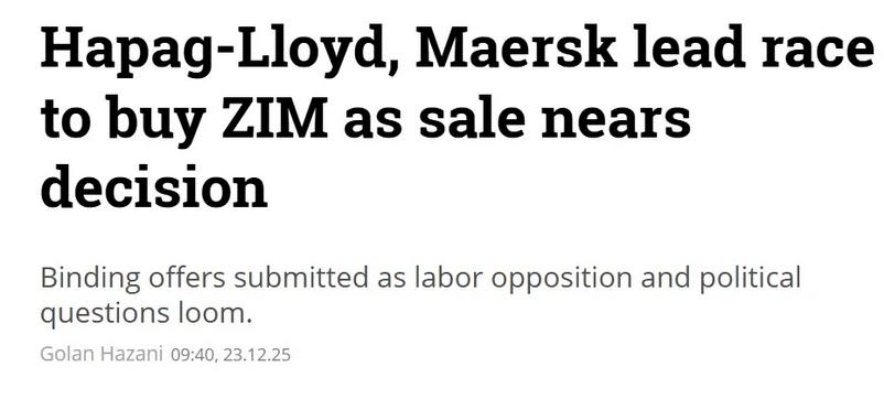 12月22日,以色列集装箱航运公司以星航运(ZIM )宣布,董事会已正式否决一项由公司管理层主导财团提出的最新收购要约,同时针对公司的战略审查仍在推进,董事会正在评估多家战略投资方提交的其他收购提议,而相关出售流程正进入关键阶段。