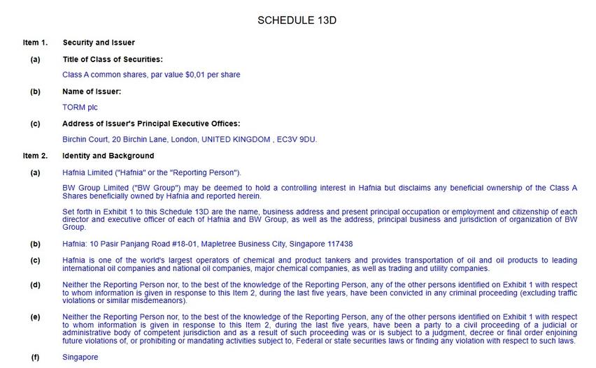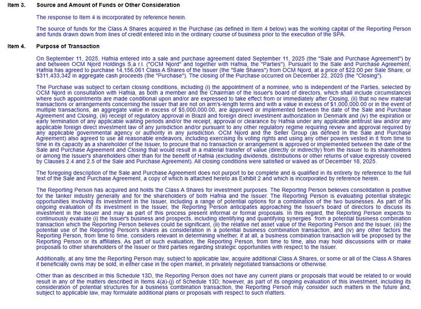 Hafnia 本周一确认,已完成从 Oaktree Capital Management 手中收购 Torm 股份的交易,交易金额约 3.11 亿美元,持股比例升至 13.97%。Torm 目前在美国和哥本哈根双重上市。值得注意的是,Hafnia 随后向监管机构提交了一份SCHEDULE 13D 文件。在资本市场惯例中,SCHEDULE 13D 文件通常被视为“战略投资”信号,而非单纯的财务性持股,这一动作迅速引发市场高度关注。