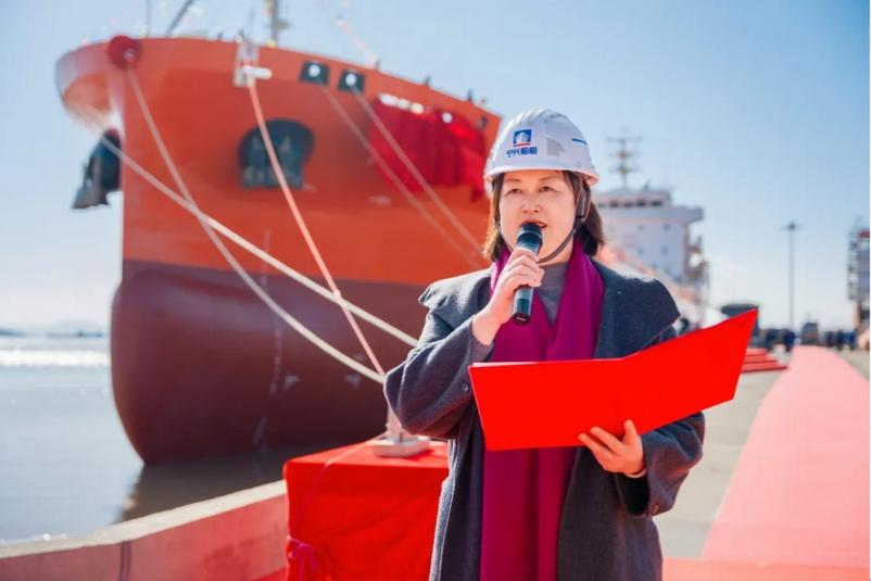 兴通万邦副董事长邱鹏女士受邀担任本船教母,依次完成剪彩、掷瓶礼及新船揭幕命名仪式,并为 “善邦” 轮顺利启航送上美好祝福。