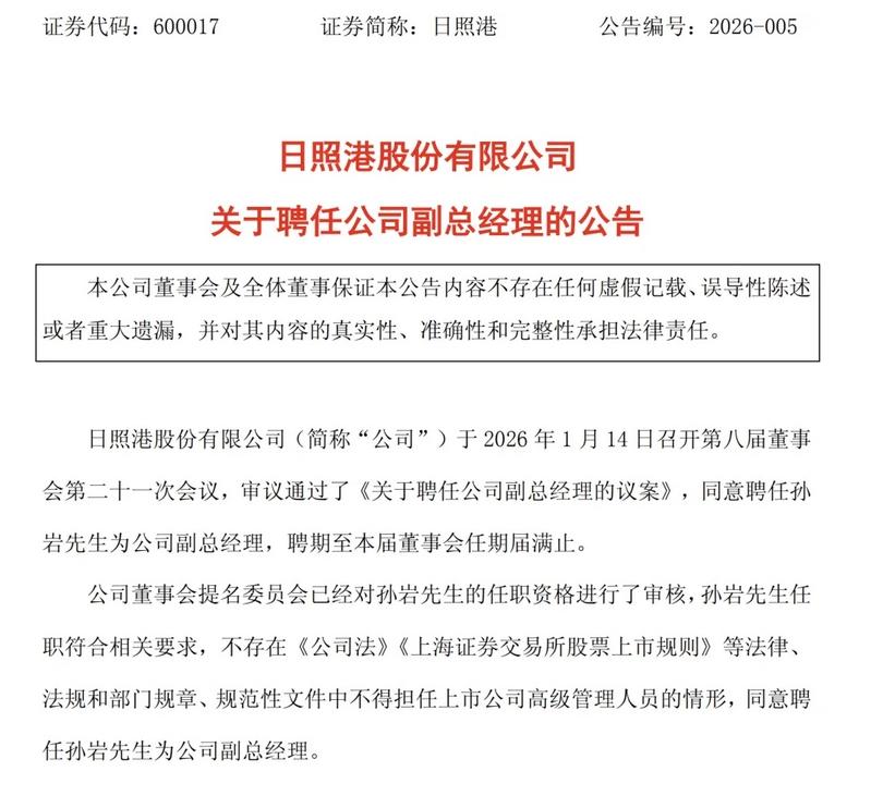 1月15日,日照港股份有限公司(证券代码:600017,证券简称:日照港)发布《关于聘任公司副总经理的公告》。