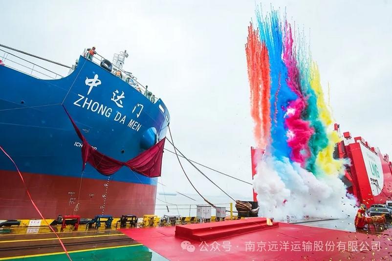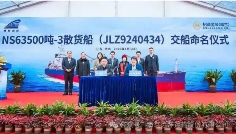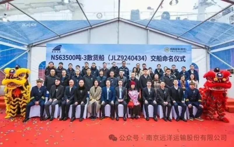1月30日,南京远洋与中能国际在招商船舶金陵船厂合作建造的NS63500-3散货船“中达门”轮在江苏仪征正式命名交付。南京远洋董事长牟宗皓、总经理陈祥旺、招商船舶金陵船厂总经理江家忠等出席活动。