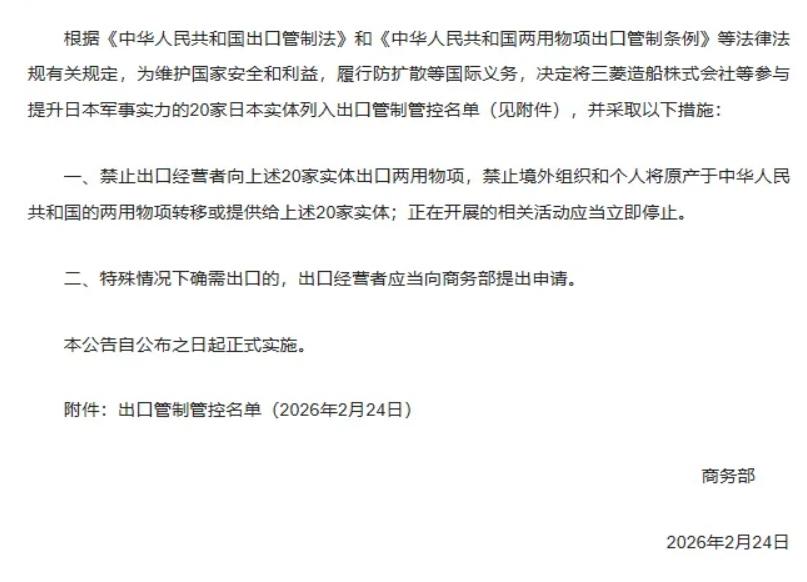 2月24日,商务部发布2026年第11号公告,将20家日本实体列入出口管制管控名单。具体内容如下: