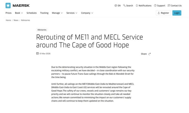 3月1日,马士基表示,由于中东地区军事冲突升级,安全形势恶化,公司在与安全伙伴密切协调后决定,暂时暂停未来经由曼德海峡的跨苏伊士运河航行。