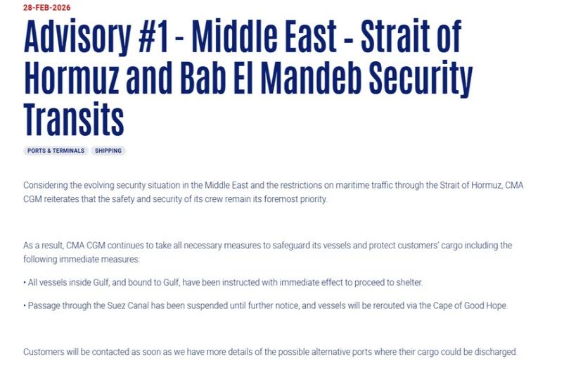 2月28日,达飞海运发表声明称,鉴于中东地区不断变化的安全形势以及霍尔木兹海峡海上交通的限制,公司重申,船员的安全保障仍然是其首要任务。因此,达飞轮船继续采取一切必要措施保障船舶安全和客户货物安全,包括以下立即采取的措施: