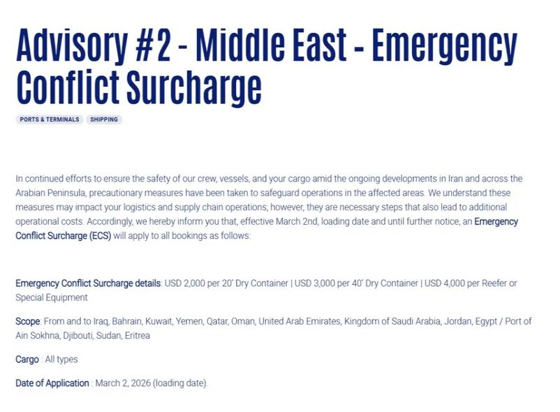 紧急冲突附加费申请日期为2026年3月2日(装运日期),涵盖所有货物类型,地点范围包括往返伊拉克、巴林、科威特、也门、卡塔尔、阿曼、阿拉伯联合酋长国、沙特阿拉伯王国、约旦、埃及/艾因苏赫纳港、吉布提、苏丹、厄立特里亚。