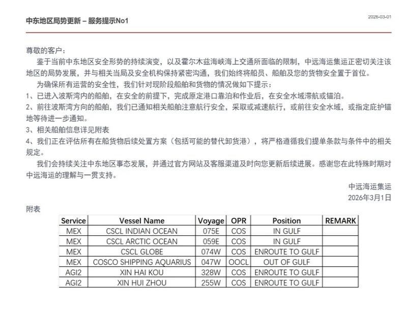 同日,中远海运集运在一份声明中称,鉴于当前中东地区安全形势的持续演变,以及霍尔木兹海峡海上交通所面临的限制,中远海运集运正密切关注该地区的局势发展,并与相关当局及安全机构保持紧密沟通,我们始终将船员、船舶及您的货物安全置于首位。为确保所有运营的安全性,我们针对现阶段船舶和货物的情况做如下提示: