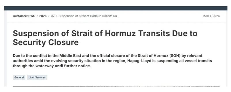 3月1日,赫伯罗特发表声明称,由于中东冲突以及相关当局在地区安全形势不断变化的情况下正式关闭霍尔木兹海峡,赫伯罗特公司暂停所有船舶通过该水道,直至另行通知。