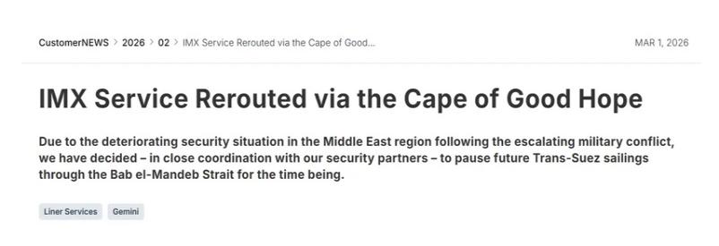 “我们始终致力于最大程度地减少对客户供应链的影响,并将持续向客户通报最新情况。一旦局势稳定且安全状况允许,我们将继续优先使用跨苏伊士运河航线运营IMX服务,因为这是我们为客户提供服务最快捷、最可持续、最高效的方式。”
