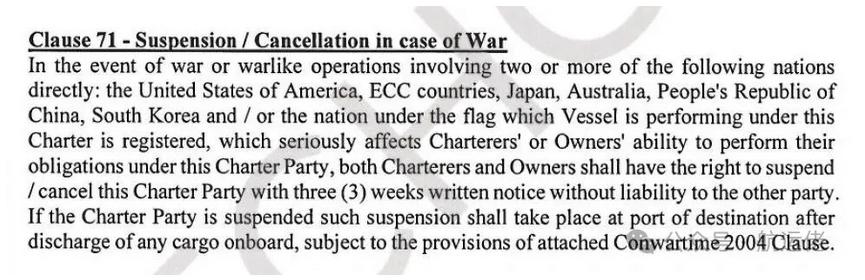 与第71条的关系:第71条明确写明“subject to the provisions of attached Conwartime 2004 Clause”,表明CONWARTIME 2004条款的适用不受第71条影响,两者是并存的。CONWARTIME 2004主要用于处理航程中的风险,而第71条是专门针对特定国家间爆发战争时赋予的取消权。