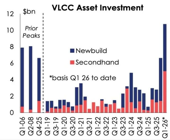在资产价格高位运行之际,新造船订单亦呈现“强势追涨”态势,2026年第一季度或成为VLCC历史上投资规模最大的季度。克拉克森在最新周报中披露,今年以来VLCC新单已接近50艘。
