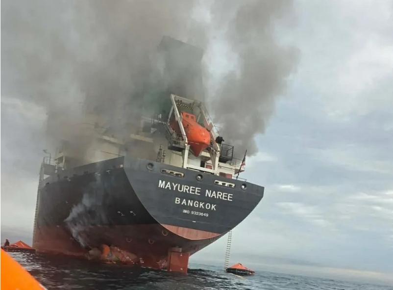 据泰国船东珍宝航运(Precious Shipping)披露,散货船“Mayuree Naree”轮在穿越霍尔木兹海峡时遭到两枚来源不明的抛射物击中,事故导致船舶起火,并对机舱区域造成损坏。