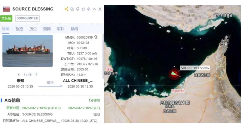 英国海上贸易行动处(UKMTO)表示,船上确实发生火灾,但在黑暗中受损情况尚不明确,所幸船员均安全,无环境污染报告。马士基方面确认:“‘Source Blessing’轮在波斯湾当地时间周四清晨遭遇事故。船上发生火灾,但在船员扑救下已得到控制并完全扑灭。”