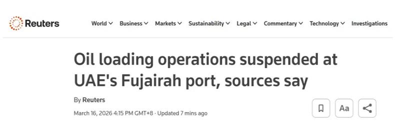 另据路透社报道,由于富查伊拉港因无人机袭击引发火灾,港口石油装船作业已被迫暂停。