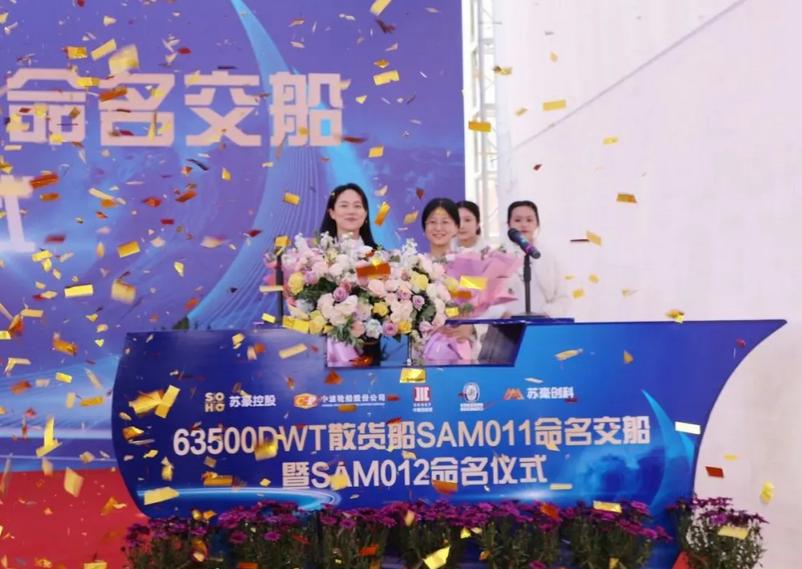 新船命名交付仪式在江苏苏豪船厂举行,各界领导嘉宾齐聚一堂共同见证。苏豪创科集团、中建投租赁、中波公司等项目相关方领导先后致辞。两艘新船在两位船母的命名祝福声中开启上线营运倒计时。
