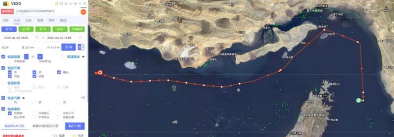 中远海科旗下船视宝向《海运圈聚焦》提供的数据显示,4月9日下午,“VEXO”轮(载重吨309,497吨,建于2000年)自富查伊拉以南海域启程,进入霍尔木兹海峡航道,并于4月10日凌晨顺利抵达波斯湾水域。目前,该轮AIS目的地显示为“To order”,反映出市场在高度不确定环境下,货盘指向仍存弹性。