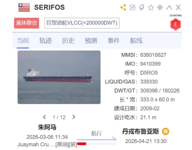 据船舶AIS追踪数据,4月11日,“SERIFOS”轮成为美伊达成临时停火协议后,首艘驶离霍尔木兹海峡的超大型油轮(VLCC)。