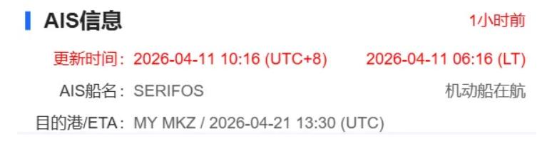 中远海科旗下船视宝为《海运圈聚焦》提供的AIS数据显示,“SERIFOS”轮早在3月1日即通过霍尔木兹海峡进入波斯湾水域,并于3月6日抵达沙特朱阿马港(Juaymah)完成装货。此后,该轮在波斯湾内长时间等待,直至4月11日5时才启程驶出霍尔木兹海峡,目前航向显示为马来西亚丹戎布鲁亚斯港。