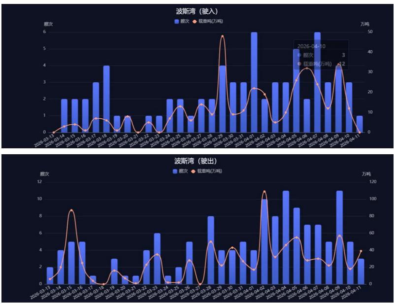 不过,从整体通行数据来看,复航进程依然缓慢。船视宝数据显示,4月10日波斯湾船舶通行总量仅为8艘次,其中集装箱船2艘次、LPG船1艘次,其余为其他类型船舶,原油船、成品油船及LNG船均未出现通行记录;当日驶入3艘次、驶出5艘次。