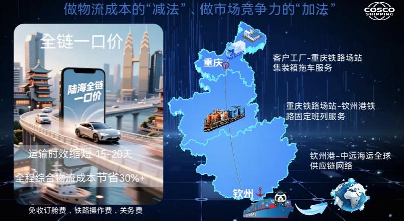 “陆海全链一口价”产品:该产品依托西部陆海新通道固定班列,有效确保内陆运输时效,并通过联动航运网络,切实保障舱位与用箱。不仅预计可以降低综合物流成本30%以上,还能以全程可视化的单一对接窗口服务,全方位助力“重庆制造”安全、高效、经济出海。