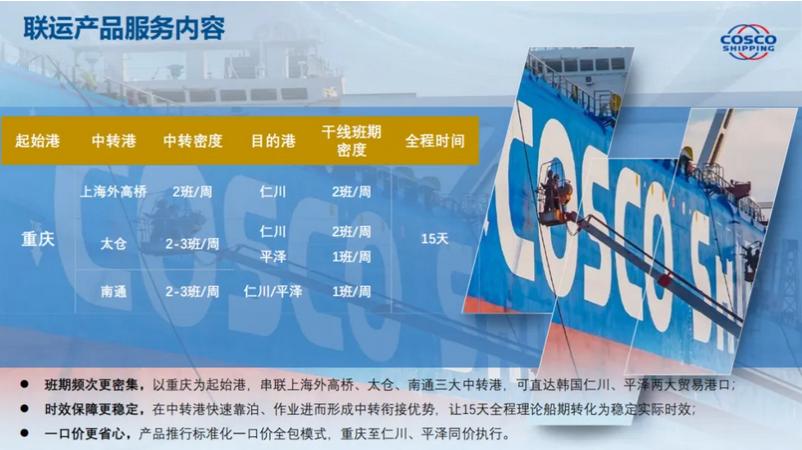 “重庆至韩国外贸江海联运” 产品:该产品凭借重庆至韩国仁川/平泽约15天的稳定交货期,以及通过自营与合作航线协同保障舱位箱源,可以为客户提供“一箱直达、一票联运”的全程服务体验。