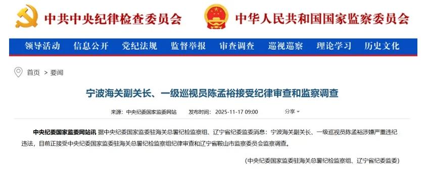宁波海关副关长、一级巡视员陈孟裕,涉嫌严重违纪违法