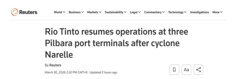力拓:三个铁矿石码头恢复作业