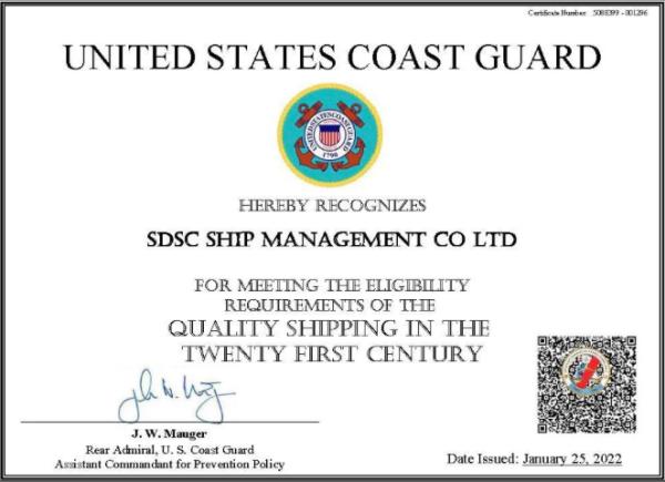 山东海运权属单位及其所管船舶获美国海岸警卫队颁发证书